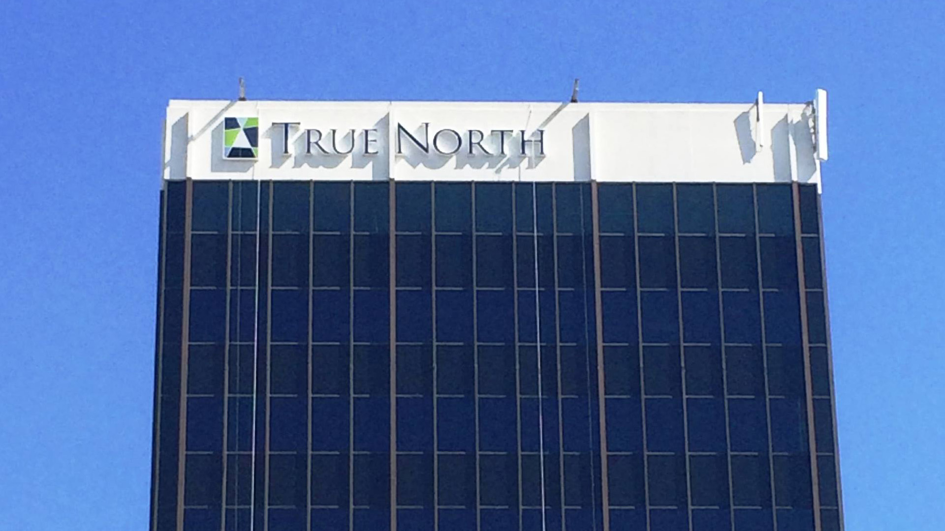 - Large-format building signage designed for maximum visibility at distance.